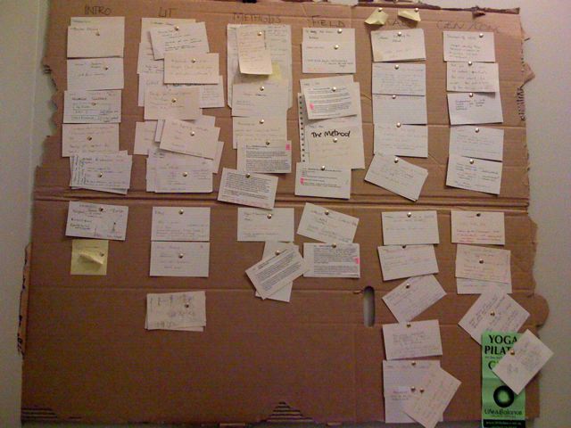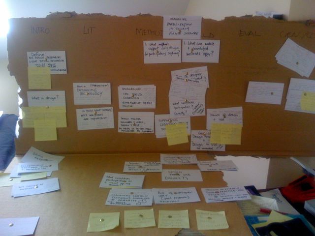 That’s why affinity mapping type exercises are integral to the thinking and sketching process I have been using to discover and synthesis the structure and layers of my PhD thesis this last two years. Here are some earlier shots of “arranging” the PhD. I use this method to capture the various areas that need to be covered by writing down everything I can think of on an Index card, either over a few sessions or as they come out (Thanks Tim, thanks Agile).